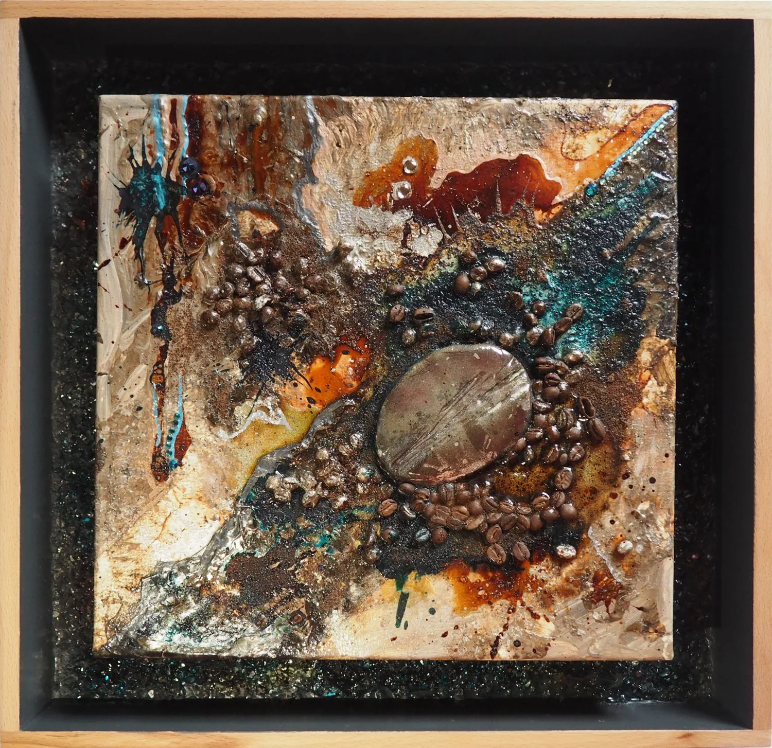 Dieses Kunstwerk auf Leinwand (30 × 30 × 4 cm) wird eingerahmt in massivem, fein geschliffenem Buchenholz (40 × 40 × 6 cm). Die fachmännisch gezinkten Seitenteile sind außen naturbelassen und biologisch gewachst, innen anthrazit lackiert. Die Rückwand ist mit glitzerndem Dekoglas, Kaffee und Acrylfarbe gestaltet. Handgetöpferte Kaffeebohnen in RAKU-Technik (7 × 9 cm) und hochwertiger Markenstrass aus Österreich ergänzen das Werk.