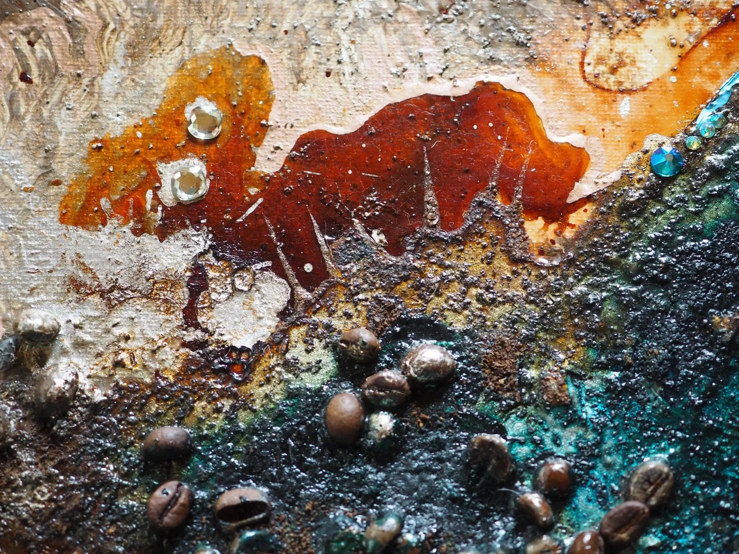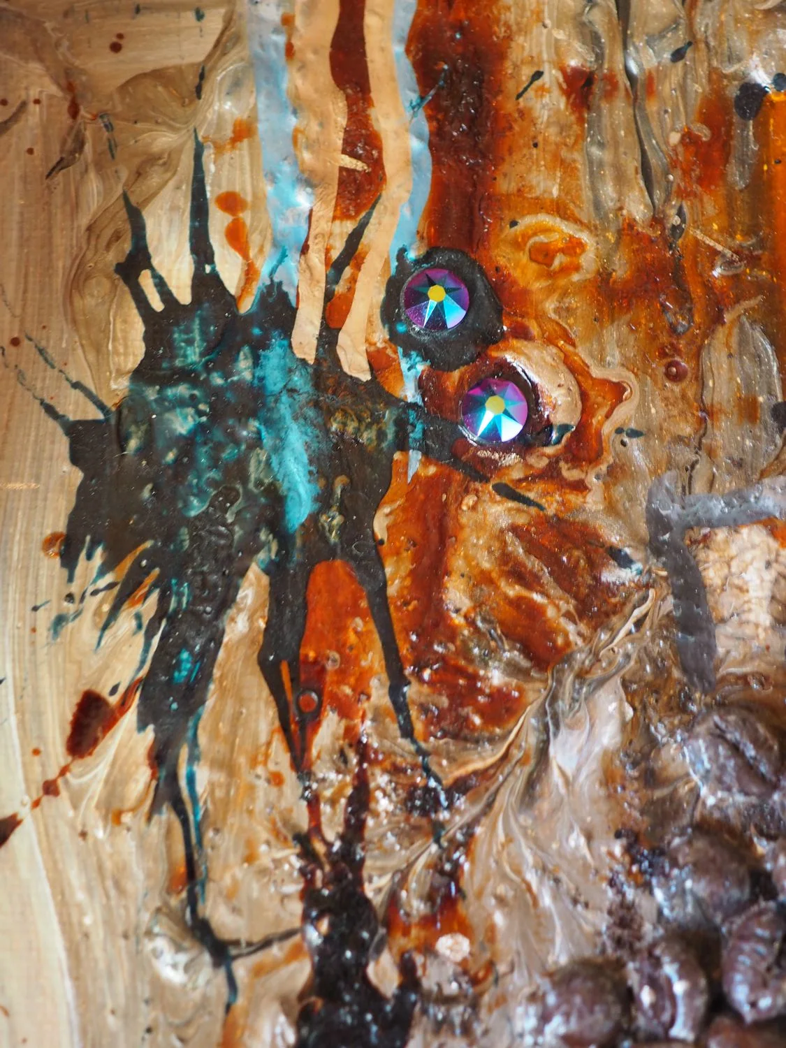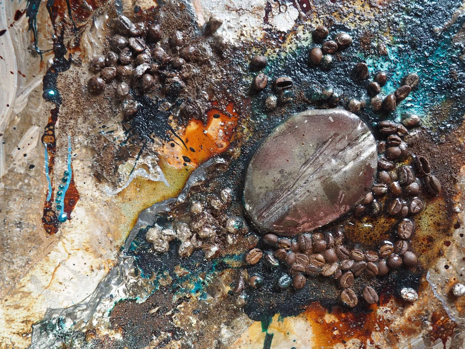 Vielfältige Acrylmalerei-Techniken, kombiniert mit echten Kaffeebohnen und Kaffee in verschiedenen Konsistenzen, Schellacktusche und Dekoglas.