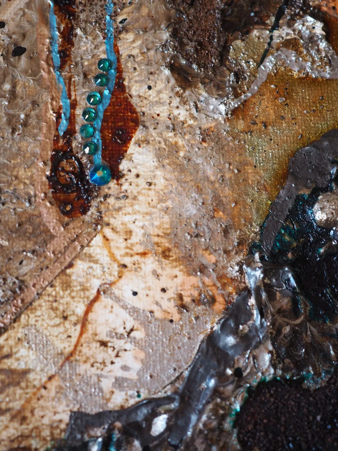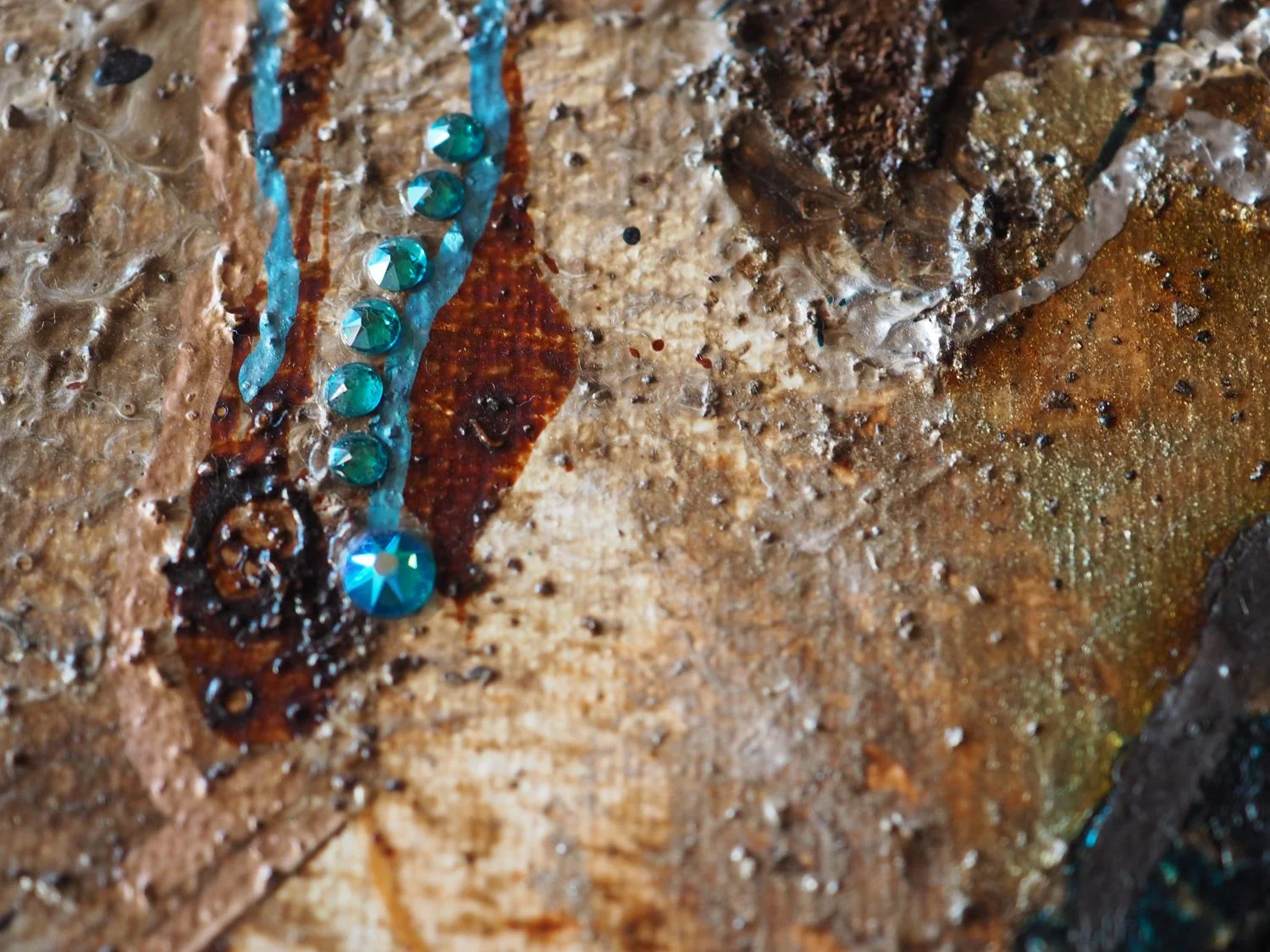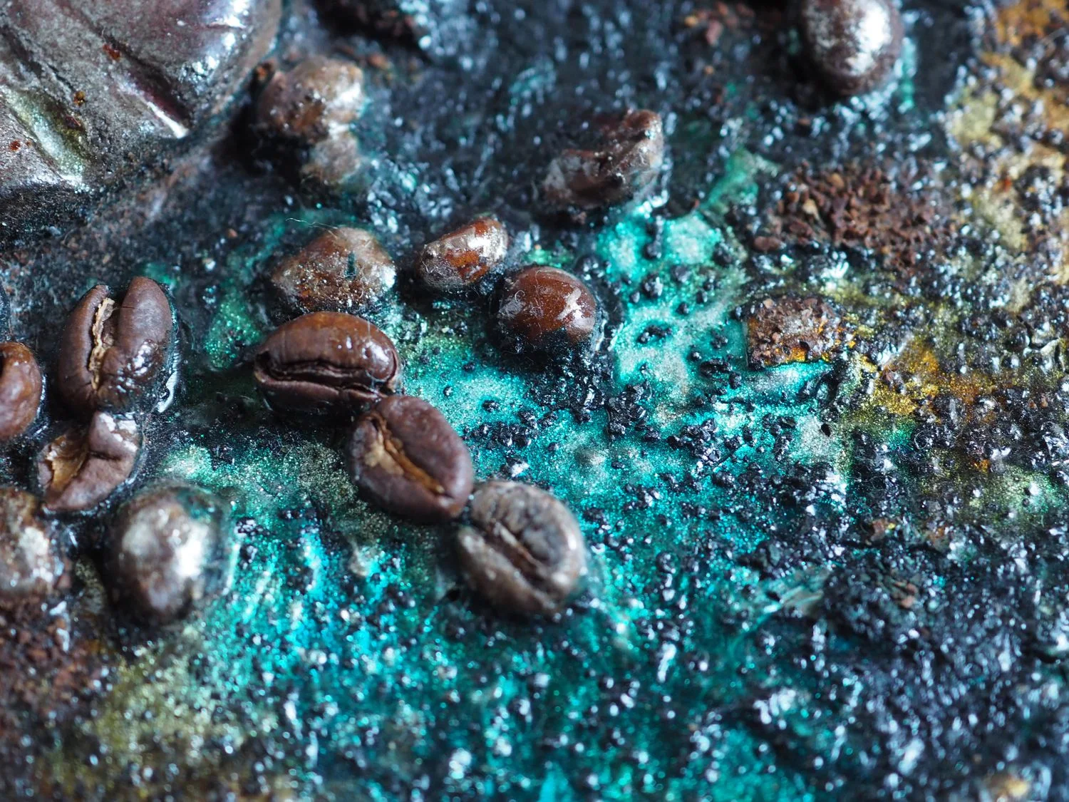 Vielfältige Acrylmalerei-Techniken, kombiniert mit echten Kaffeebohnen und Kaffee in verschiedenen Konsistenzen, Schellacktusche und Dekoglas.