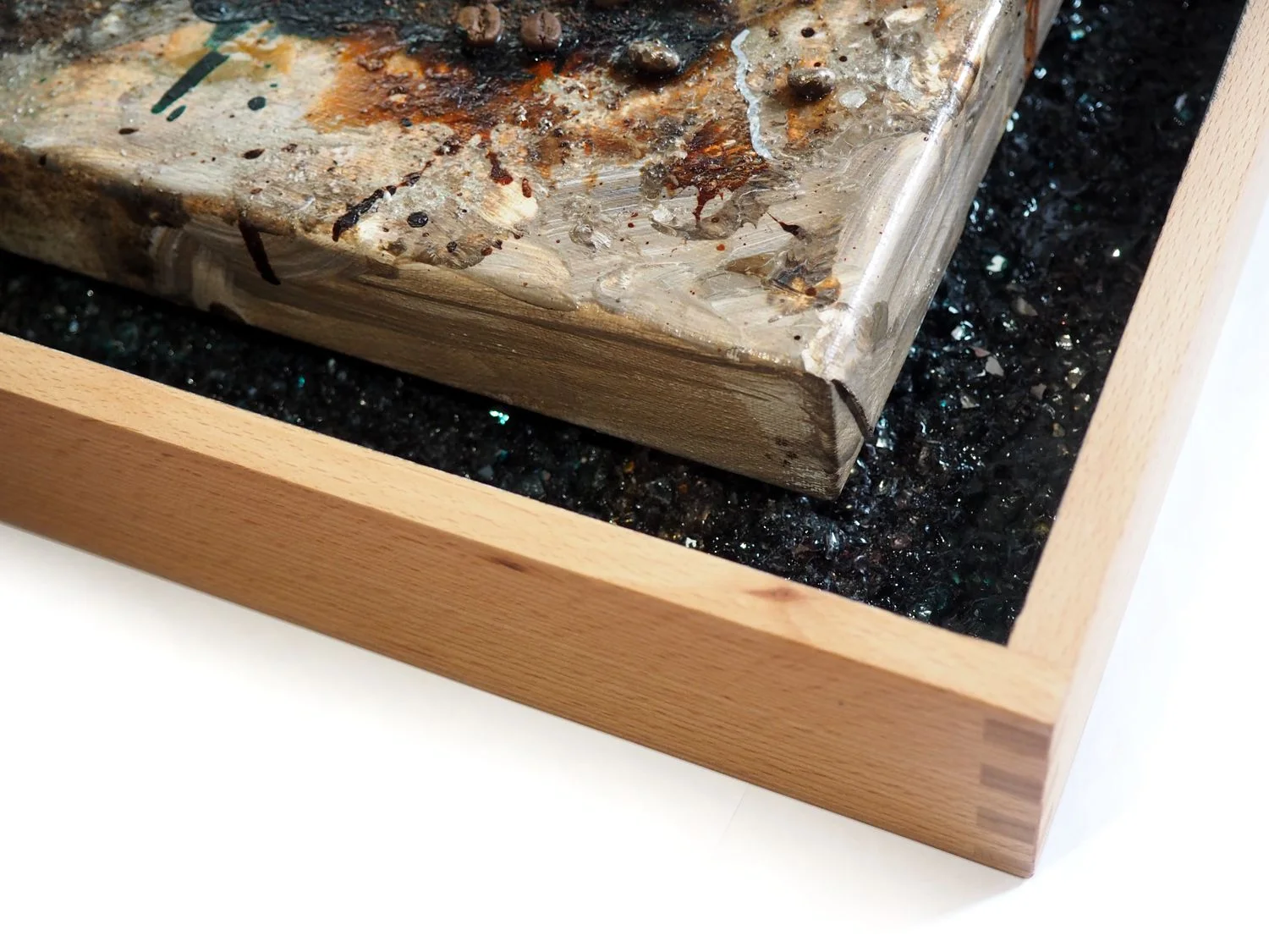 Der Boden bzw. die Rückwand des Massivholz-Rahmens ist mit einer kreativen Mischung aus Kaffee, glitzerndem Dekoglas und transparentem Acryl passend zur Leinwand gestaltet