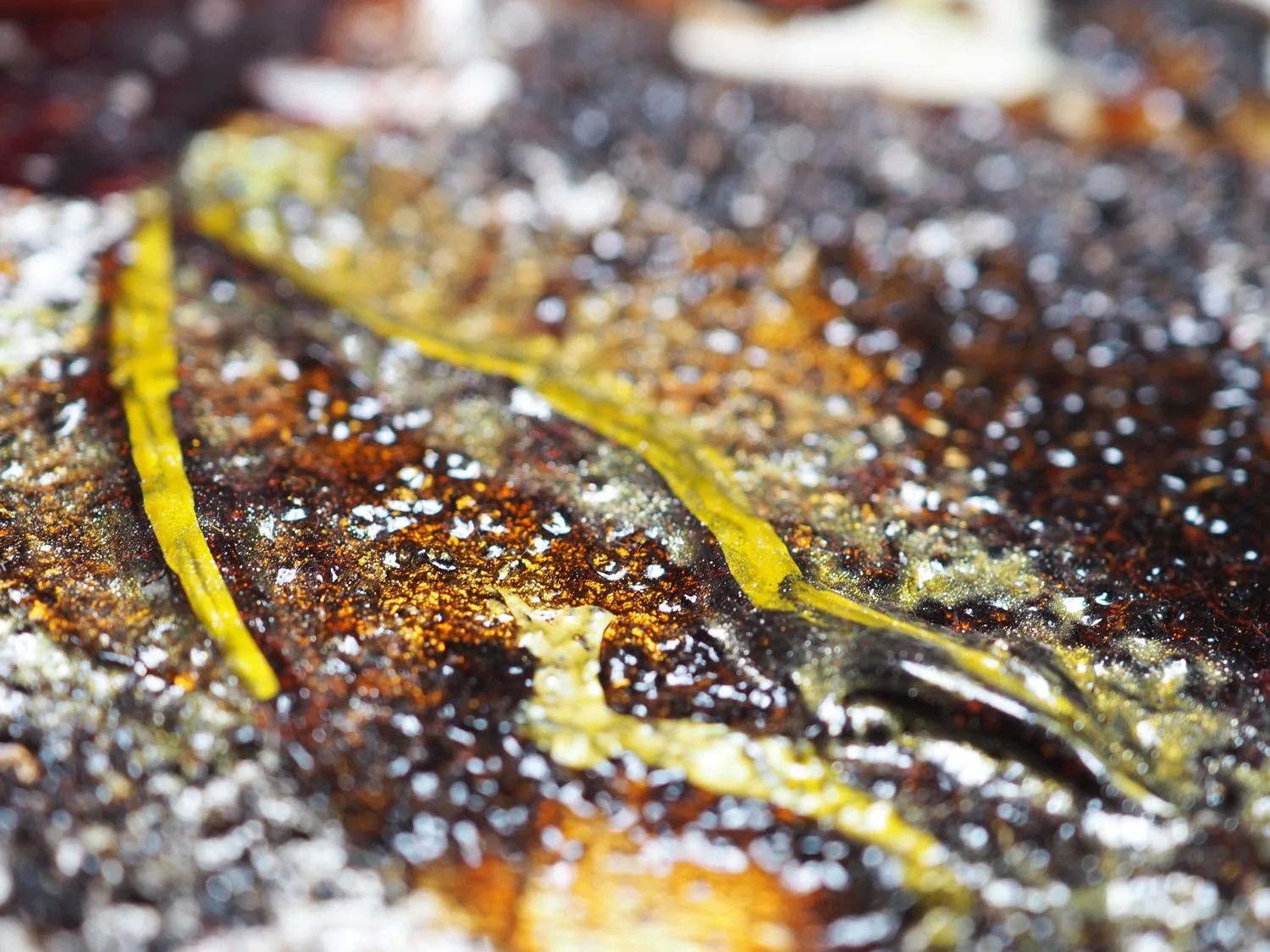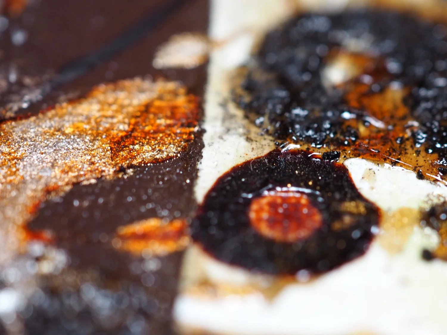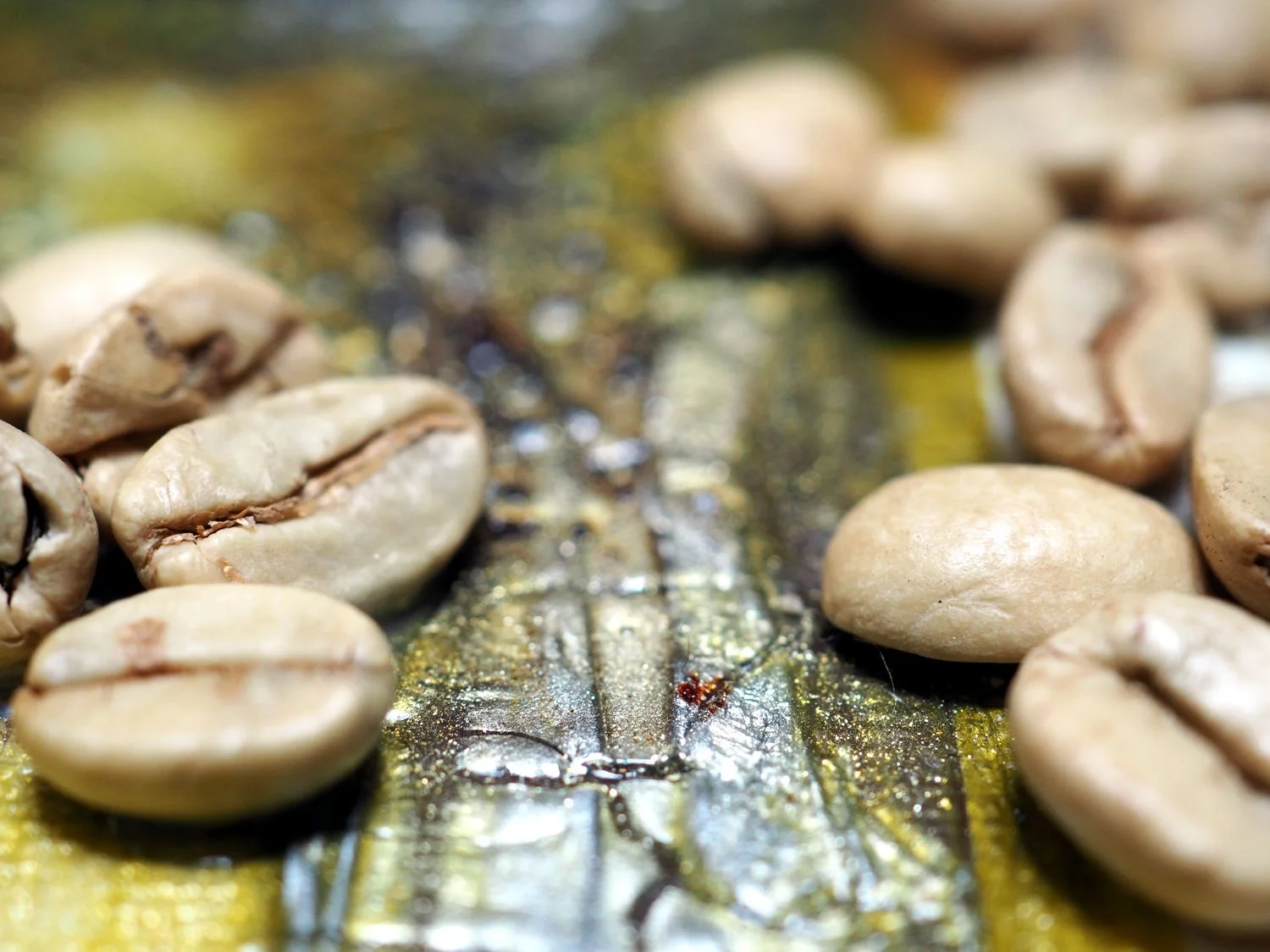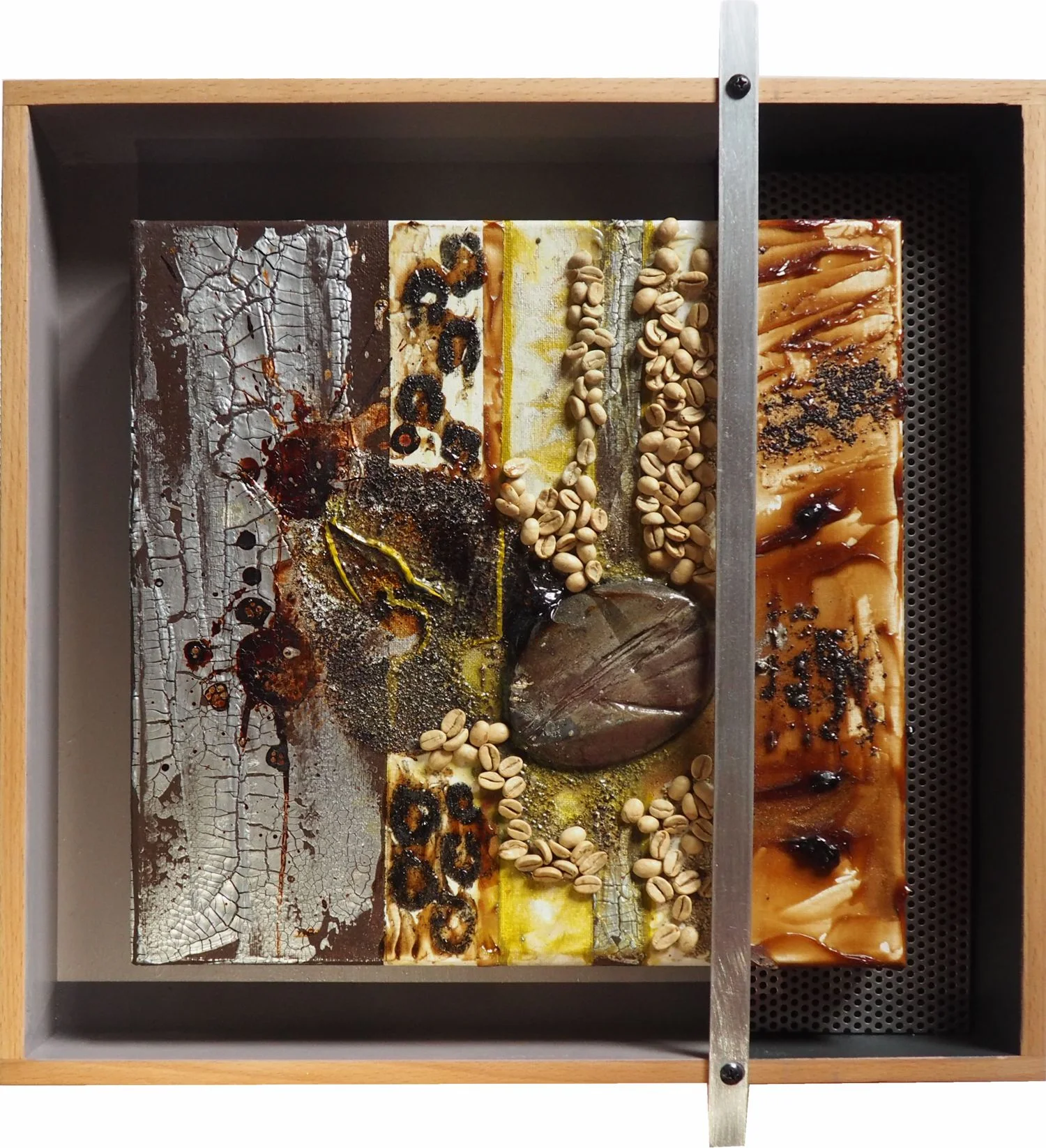 Die üppige, sinnliche Wirkung von echtem Kaffee auf Leinwand trifft auf technische Akzente – Edelstahl- und Aluminiumbleche sorgen für reizvolle Kontraste, inspiriert von professionellen Siebträgermaschinen. Eine große handgetöpferte Kaffeebohne in RAKU-Technik (7 × 9 cm) ergänzt die organische Komposition.