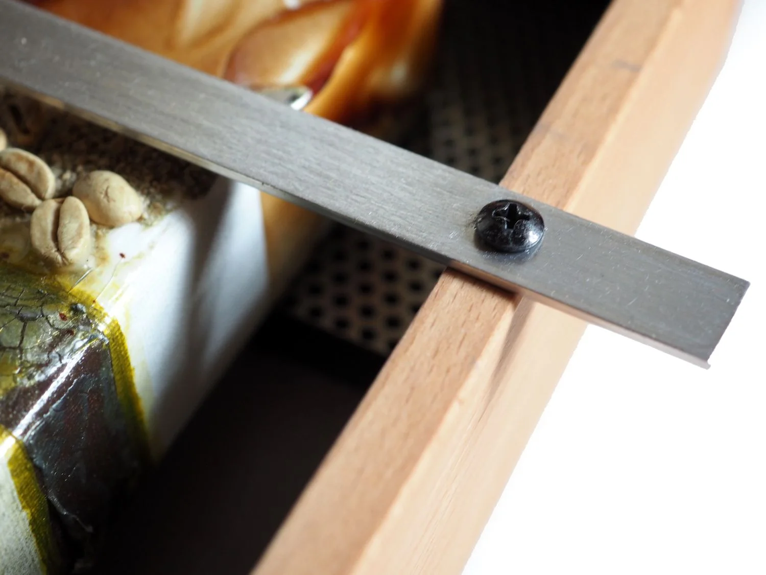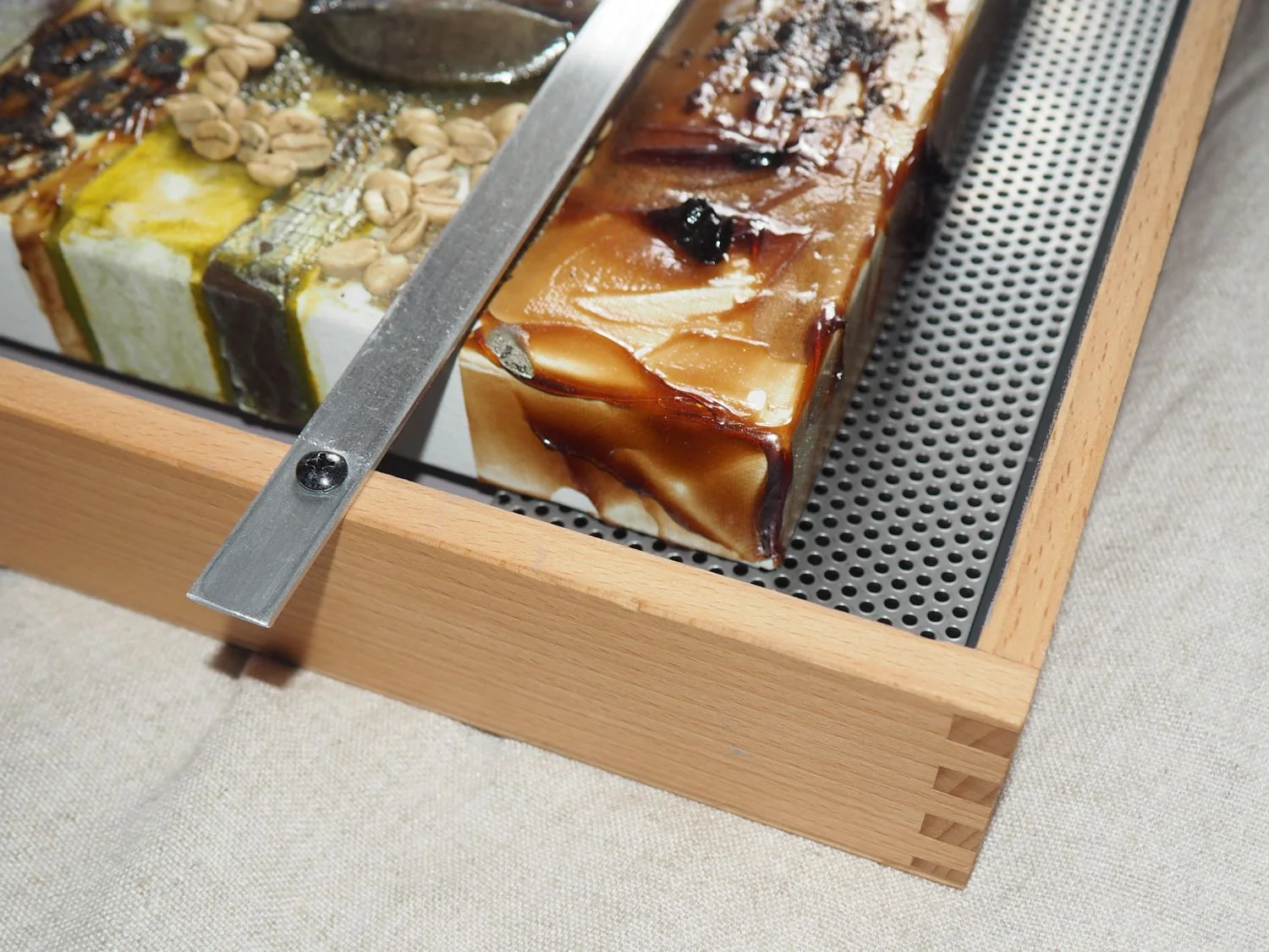 Innen sorgen die lackierten Farbtöne Latte und Anthrazit für eine moderne Wirkung; sie treffen sich unterhalb der Aluminiumleiste, wo auch das gelochte Edelstahlblech endet. Sowohl Lochblech als auch Keilrahmen sind "schwebend“ an der Rückwand montiert und verleihen dem Objekt Tiefe und Leichtigkeit. Die Rückwand verfügt über ein eingefrästes Loch zur einfachen Aufhängung.