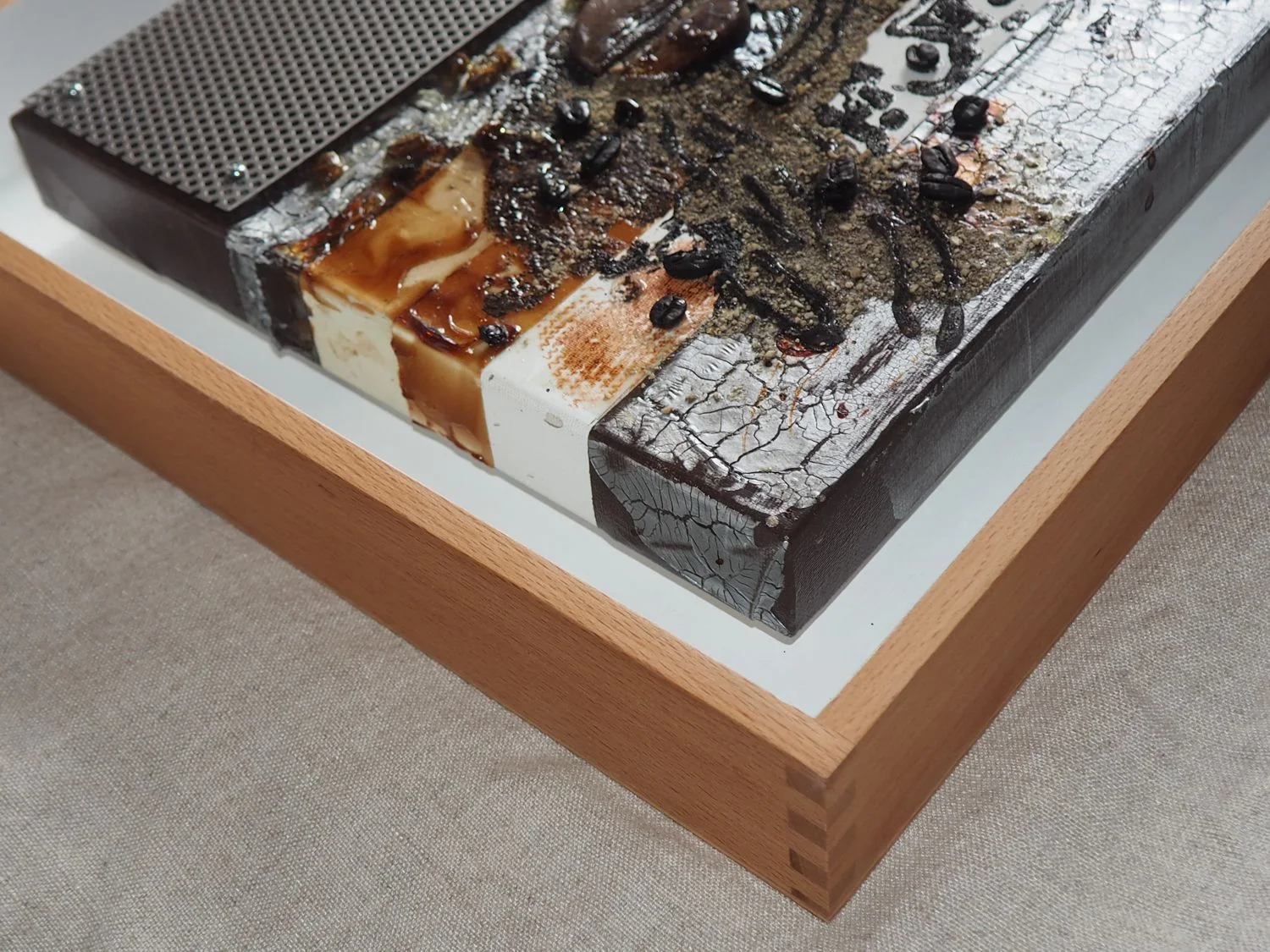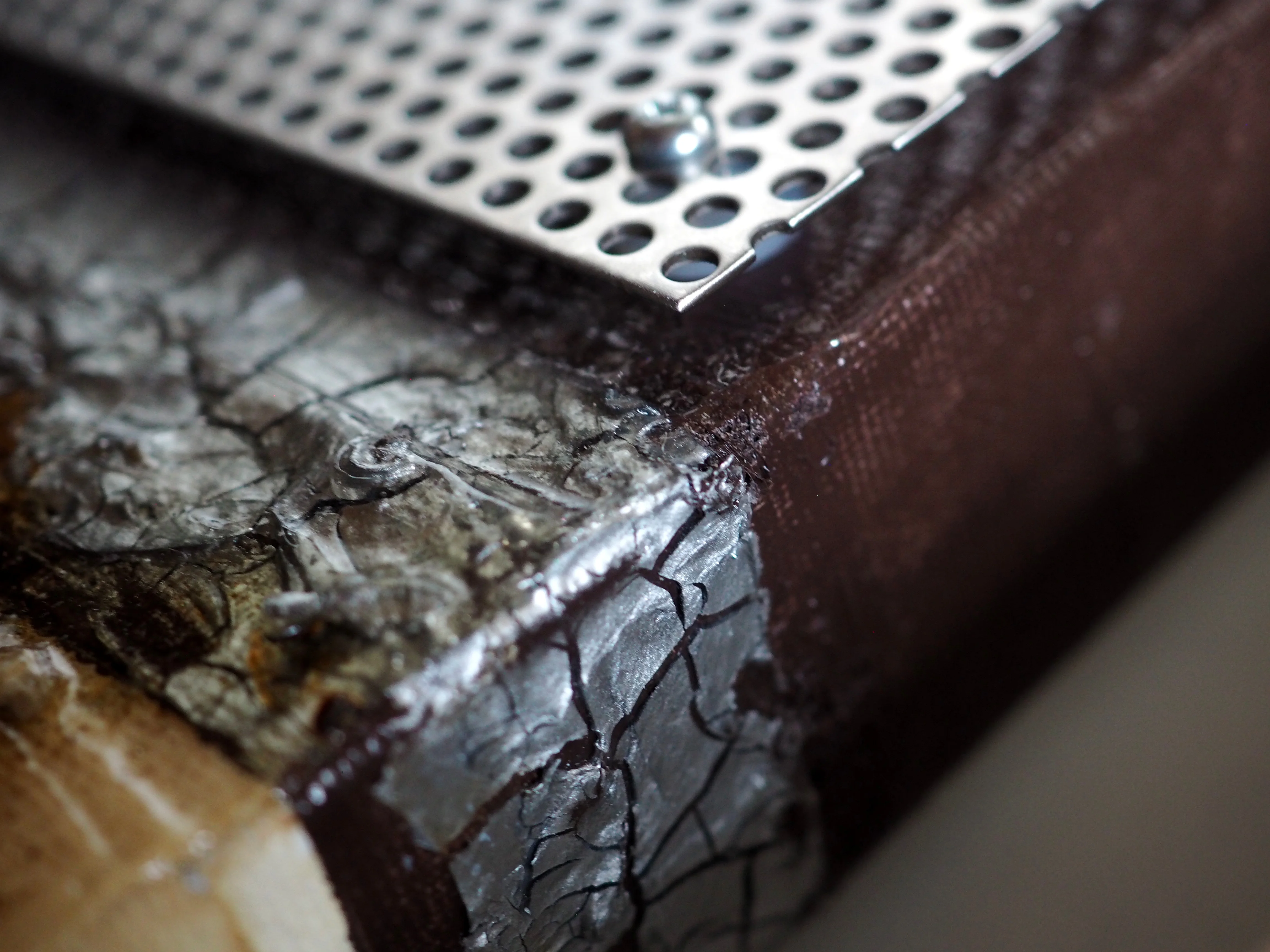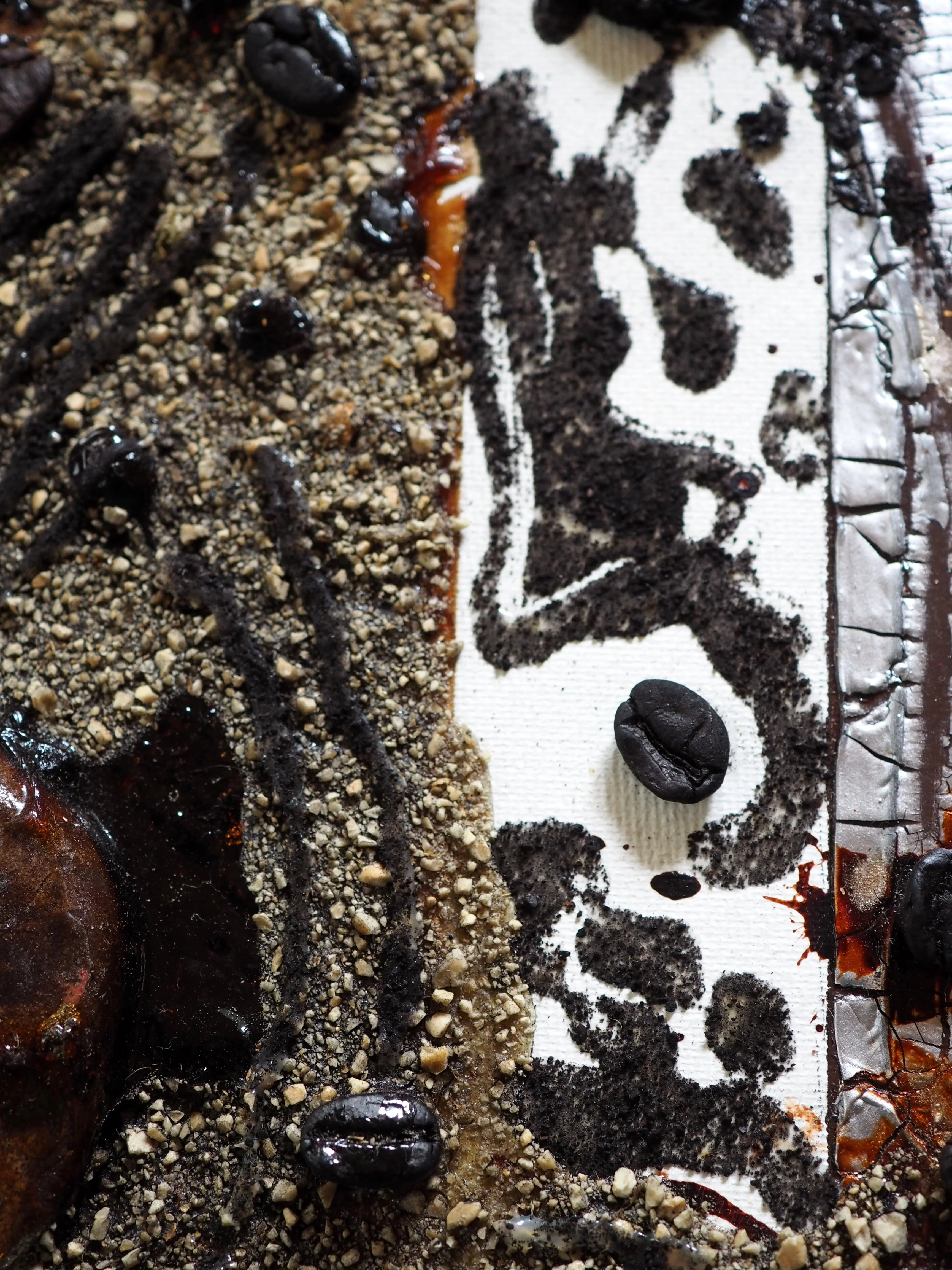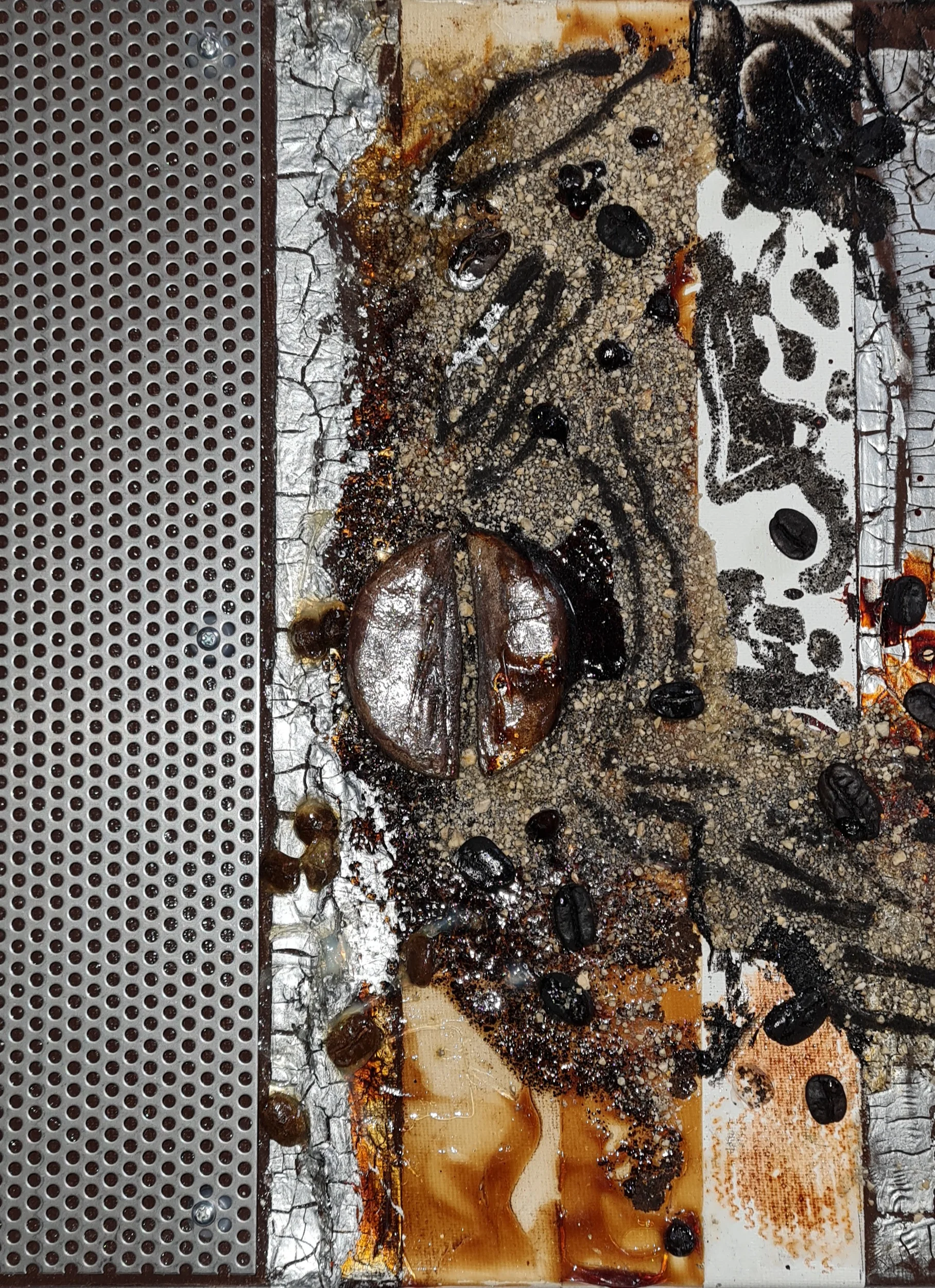Die üppige, sinnliche Wirkung von echtem Kaffee auf Leinwand trifft auf technische Akzente: Ein gelochtes Stahlblech – inspiriert von Siebträgermaschinen – ist „schwebend“ auf den Keilrahmen montiert. Mit handgetöpferter kleiner Kaffeebohne in RAKU-Technik (4 × 7 cm) wird die technische Gestaltung betont.