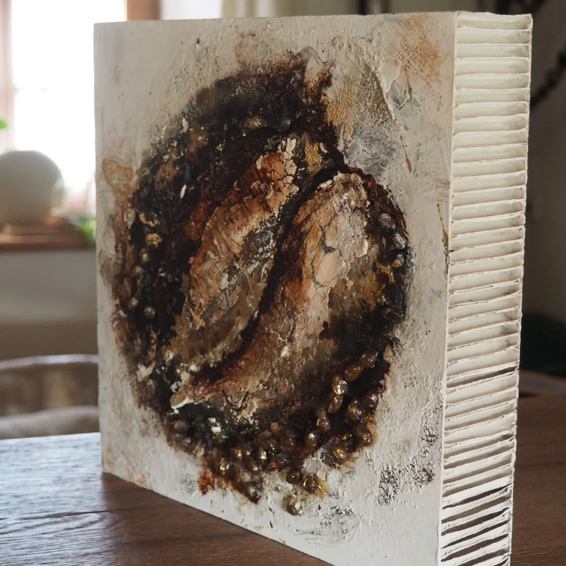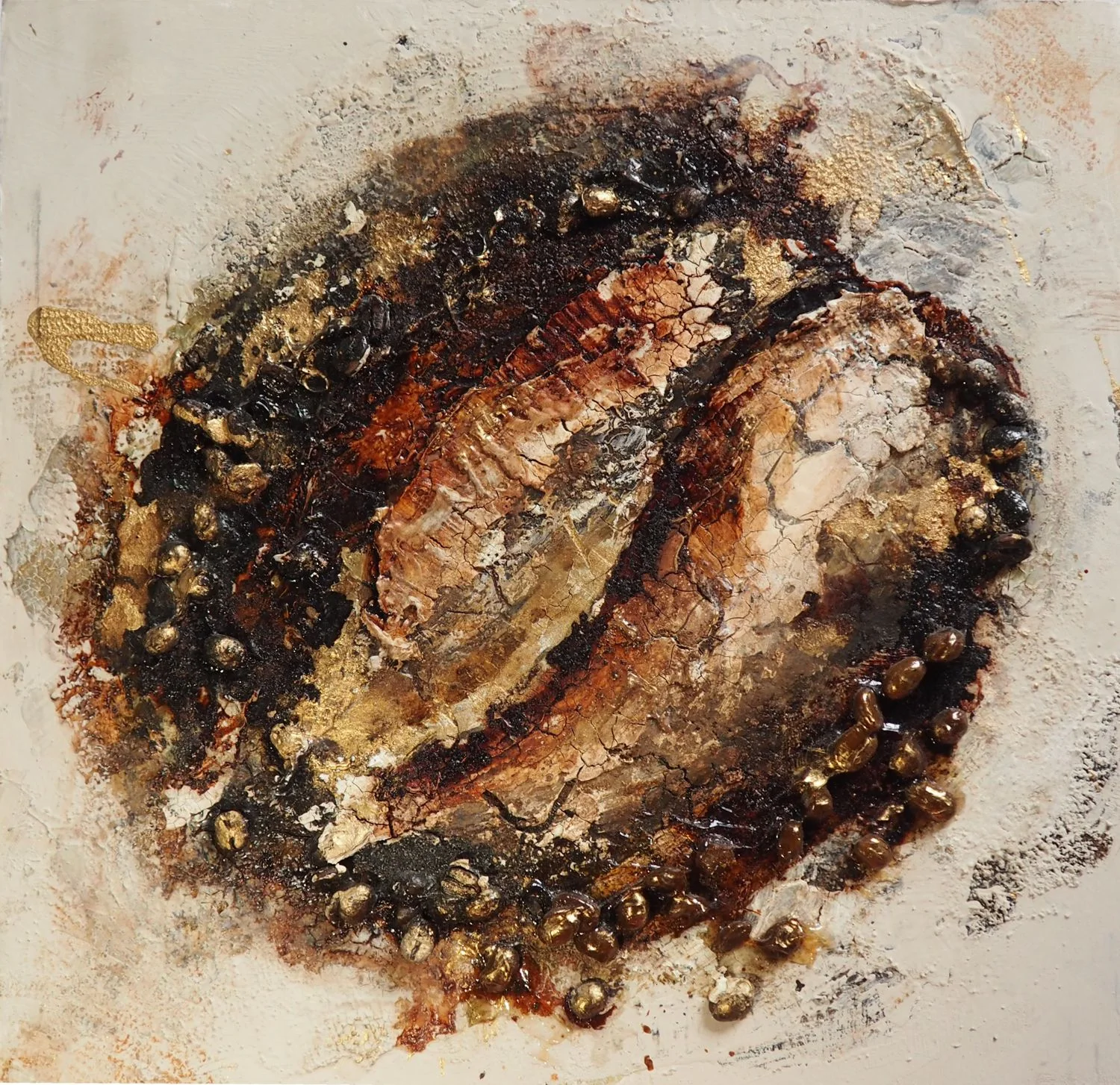 Dieses außergewöhnliche Werk kombiniert Acrylmalerei, Schellacktusche, echtem Kaffee und Kaffeebohnen auf einer stabilen Wabenplatte (ca. 30 x 30 x 6 cm) und bietet eine spannende Alternative zur klassischen Leinwand. Die strukturierte Oberfläche wurde in einem sanften cremeweißen Lack bearbeitet, der das Spiel von Licht und Schatten verstärkt und dem Werk eine dynamische, lebendige Wirkung verleiht. Die Rückseite ist genauso sehenswert wie die Vorderseite. Dank des leichten Materials lässt sich das Werk frei aufstellen oder an der Wand präsentieren. Für eine Aufhängung vertrauen wir auf Ihren guten Geschmack.